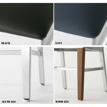 前側の脚はアルミとウッドからお選びいただけ(こちらはアルミレッグ)、シートもネイビーとブラックの2色からお選びいただけます。